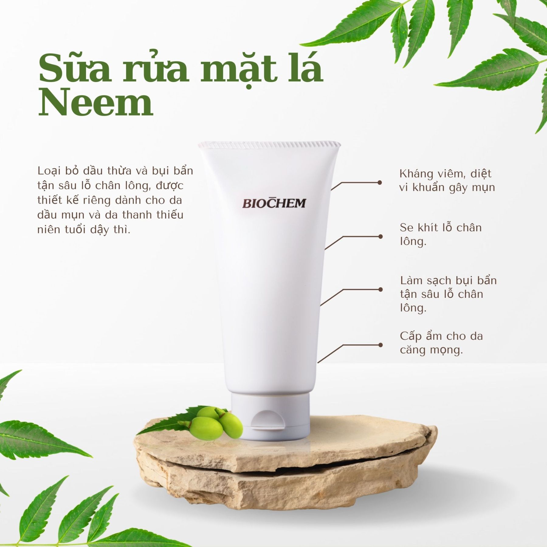 Sữa rửa mặt chiết xuất Neem giúp loại bỏ dầu thừa và bụi bẩn sâu trong lỗ chân lông, kiểm soát dầu, kháng viêm, tiêu diệt vi khuẩn gây mụn.