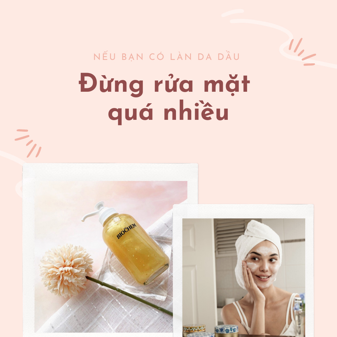 Làn da thường xuyên đổ dầu khiến bạn cảm thấy khó chịu vô cùng. Lý do là các tuyến tiết bã nhờn dưới da hoạt động quá mức, khiến cho da luôn bóng nhờn, làm bạn luôn muốn rửa mặt và tẩy tế bào chết để da khô thoáng hơn. Tuy nhiên, thói quen đó trên thực tế kích thích da bạn càng tiết thêm nhiều dầu để bù lại lớp dầu đã mất. Mặt khác, lớp dầu tự nhiên trên da cũng có tác dụng như một màng mỏng bào vệ da khỏi vi khuẩn và tránh ngứa rát trong thời tiết hanh khô. Do đó, các nàng không nên rửa mặt quá nhiều, chỉ 2 lần mỗi ngày là đủ với một loại sữa rửa mặt chuyên dụng cho da dầu. Thêm vào đó, có thể sử dụng xịt khoáng và các mỹ phẩm có tính năng kiềm dầu để làn da luôn khô thoáng, mát mẻ.