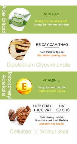• Chiết xuất lô hội: chứa chất chống oxy hóa, enzyme, Vitamin A và C có tính chống viêm cao, làm dịu vùng da sưng tấy do mụn. Tác dụng giữ ẩm của lô hội giúp cải thiện da khô, dễ kích ứng và làm mờ vết nhăn.