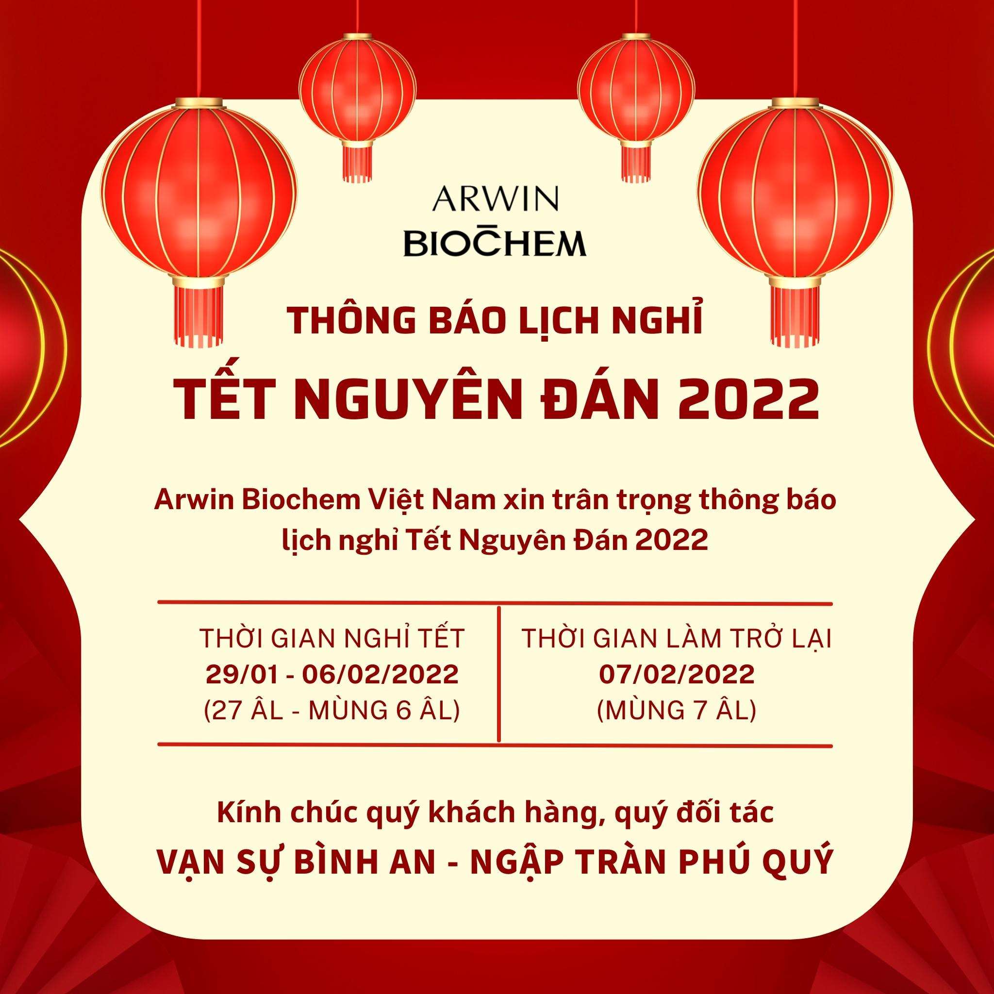 Arwin-Biochem xin trân trọng thông báo tới Quý khách hàng, Quý đối tác lịch nghỉ Tết Nguyên Đán Nhâm Dần 2022 như sau: